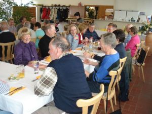 Durch den „Alten Hof“ und „Eicherhof“ ging es zunächst in die Zeppelinstraße und schließlich am Ende des Wohngebiets hinein in den Wald. Auf teilweise sehr nassen und schmutzigen Waldwegen führte die Strecke am „Löcherwäldle“ entlang und schließlich durch den „Alten Eichwald“ und über die Felder in Richtung Berkheim. Im „Hasenheim“ war für die Gruppe bereits reserviert und weitere Sängerinnen und Sänger, die direkt dahin gekommen waren, stießen noch dazu. Kurze Zeit später waren alle mit Getränken versorgt und in geselliger Runde ließ man sich das Essen schmecken. Anschließend wurden unter dem Dirigat von Werner Niepel noch einige Lieder angestimmt und in heiterer und angenehmer Stimmung verging die Zeit wie im Flug. Am frühen Nachmittag trat die Gruppe schließlich wieder den Heimweg an und gelangte zügig über die Feldwege zurück nach Denkendorf. Ein herzliches Dankeschön an unseren Sängerkameraden Albert Bock für die tolle Vorbereitung dieses gelungenen Frühjahrsspaziergangs.