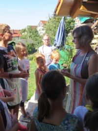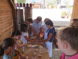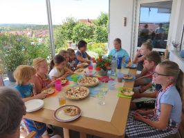 Jedes Kind durfte sich eine eigene schwäbische Pizza formen und je nach Geschmack belegen. Gespannt beobachteten die Kinder, wie die Pizzen im Ofen verschwanden. Jetzt galt es, die Brotteiglinge für das Backen nochmals zu kneten und zu formen. Mit Saaten liebevoll bestreut ruhten sie noch kurze Zeit im Backkorb. Die inzwischen fertigen Pizzen dufteten herrlich und waren bereit zum Verzehren. Nach dem Einschießen der Brote ließ sich jeder seine Pizza schmecken. Mit Gesellschaftsspielen wurde die Zeit bis zum Ausschießen der Brotlaibe überbrückt. Verwundert über die Veränderung während des Backvorgangs bestaunte die Bäckerschar ihre fertigen Laibe. Als nächstes ging es an die Fertigung der süßen Varianten. Geschickt formten die Kinder Teigstränge und flochten sie zu Hefezöpfen. Mit Hagelzucker und Mandeln bestreut kamen sie in den inzwischen etwas abgekühlten Ofen. Aus ausgewellten und zusammengerollten Teigplatten, belegt je nach Geschmack, entstanden kleine Schneckennudeln. So manche Probe des süßen Teigs verschwand genüsslich im Mund der kleinen Bäcker. Die fertigen Hefekränze verströmten einen leckeren Duft und auch die Schneckennudeln luden zum Probieren ein. Erfreut durften die Kinder ihre Brote, ihre gemeinsam zubereiteten Hefekränze und Schneckennudeln mit nach Hause nehmen.