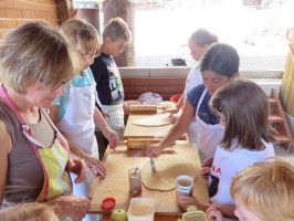 Nach einer kurzen Einführung und dem Verteilen der Zutaten ging´s an das Kneten des Brotteigs. Eifrig wurde die anfangs recht klebrige Masse zu einem glatten Teig verarbeitet und zum „Gehen“ beiseite gestellt. Gar nicht so einfach, das ist ja richtig anstrengend, stellte so mancher der Nachwuchsbäcker fest. Eine interessante Erklärung der verschiedenen Mehl- und Saatenarten leitete über zur Zubereitung des Mittagessens.