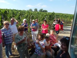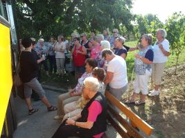 In Besigheim stand zunächst eine Führung durch die historische Altstadt auf dem Programm. Von Neckar und Enz umflossen liegt Besigheim, idyllisch eingerahmt von steil aufragenden terrassierten Weinbergen. Stadtführerin Katrin Held gab interessante Einblicke in die Geschichte der Stadt, erzählte von bekannten Persönlichkeiten und ließ an passenden Stellen lustige Anekdoten oder ein treffendes Gedicht einfließen. In der Stadtkirche stimmte Vizechorleiterin Christine Wellner spontan den Kanon „Dona nobis pacem“ an, was in dem hohen Altarraum sehr klangvoll zur Geltung kam. Nach einem leckeren Mittagessen in der malerischen Altstadt ging es mit dem Postbus weiter nach Hessigheim zur Felsengartenkellerei. Dort stieg Heidi Nägele zu und startete mit den Damen zu einer dreistündigen Rundfahrt durch die Weinberge rund um Besigheim. Zunächst ging die Fahrt hinauf zu den bekannten „Felsengärten“ von Hessigheim. Hier stieg die Reisegruppe aus und spazierte auf einem schmalen Weg, der direkt an der Hangkante der Felsengärten verläuft, zu einem sonnigen Plateau, wo es die erste Weinprobe gab. Anschließend wurden mit dem Bus drei weitere schöne Aussichtspunkte in Neckarwestheim, Walheim und oberhalb von Besigheim angefahren und bei jedem Halt eine andere Sorte Wein verkostet. Heidi Nägele gab nicht nur interessante Einblicke in den Weinbau sondern verstand es auch ausgezeichnet, die Gruppe mit lustigen Geschichten und Anekdoten zu unterhalten, so dass die Führung sehr kurzweilig war.