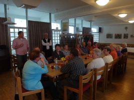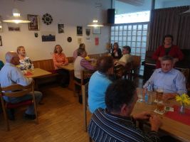 Vom Parkplatz der Festhalle aus ging es zunächst am „Österbächle“ entlang hinunter ins Körschtal und dann an der Nellinger Kläranlage vorbei bis zum Ortseingang von Nellingen. Über die Wettenhartstraße führte die Wegstrecke weiter durch den Nellinger Klosterhof und die Otto-Schuster-Straße bis zum Vereinsheim der Eintracht Nellingen „an der Halle“. Im „Eintrachtstüble“ wurden die durstigen Einkehrer bereits von Vorstand Hans-Dieter Bauer und seinem Helferteam erwartet und freudig begrüßt. Weitere Sängerinnen und Sänger, die mit dem Auto nach Nellingen gekommen waren, stießen zur Gruppe dazu, so dass schlussendlich 35 Personen den gemütlichen Gastraum füllten. Jeder ließ sich sein Schnitzel mit Kartoffelsalat gut schmecken und anschließend wurden unter der Leitung von Erika Wagner auch noch einige Lieder angestimmt und fröhlich geschunkelt. Am frühen Nachmittag machte sich die Wandergruppe wieder auf den Weg zurück nach Denkendorf.