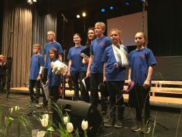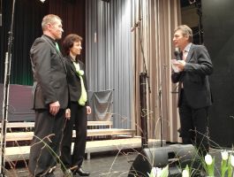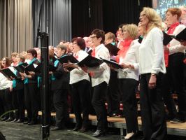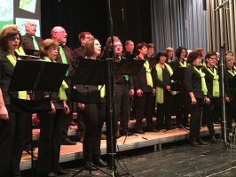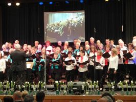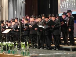 In Anlehnung an den chronologischen Ablauf der Vereinsgeschichte folgte anschließend der Chor „Stimmgabel“ mit den Titeln „Barbar Ann“ und „Über’n See“ sowie der Jugendchor „Fermate“ und die „Denkendorfer Klangsternchen“ mit ihrem fröhlichen Beitrag „Alles jubelt“. Die beiden Vereinsvorsitzenden Dieter Waller und Bettina Hornek moderierten auf gelungene und unterhaltsame Weise die verschiedenen historischen Abschnitte und sorgten jeweils für eine passende Überleitung. Darüber hinaus wurden im Hintergrund auf einer Leinwand Bilder zu den jeweiligen Ensembles eingeblendet. Ein großer Schlusschor mit allen beteiligten Chören beendete den ersten Programmteil mit dem stimmgewaltigen „Lied an die Freude“. Zuvor erhielten Ehrenvorstand Horst Pösl sowie die ehemaligen Vorstände Werner Koch und Irene Heubach als Dank für ihre langjährige Amtsführung ein Präsent von Seiten des Vereins.