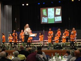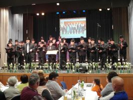 Im zweiten Programmteil wurden Anne Demuth für 25 Jahre Mitgliedschaft im Verein, Elli Gesell für 40 Jahre „aktives Singen im Chor“ sowie Altbürgermeister Walter Dieterich für 60 Jahre passive Mitgliedschaft im Verein geehrt. Udo Goldmann, Präsident des Chorverbands Karl Pfaff, ehrte Frau Gesell auch von Seiten des Verbands. Im Rahmen seines Grußwortes zum Vereinsjubiläum überreichte er an den Vorsitzenden Dieter Waller - stellvertretend für den Liederkranz - eine Ehrenurkunde des Deutschen Chorverbands. Auch Bürgermeister Peter Jahn richtete seitens der Gemeinde ein Grußwort an die Festgäste und übergab ein Jubiläumsgeschenk an die beiden Vorsitzenden. Anschließend unterhielten die „Denkendorfer Klangsternchen“ und der Jugendchor „Fermate“ mit fetzigen Melodien, die teilweise auch choreografisch untermalt waren. Der Chor „Stimmgabel“ startete im zweiten Teil zunächst mit einem Schwarzlichtauftritt zu dem bekannten Titel „Conquest of Paradise“ von Vangelis und unterhielt darüber hinaus mit weiteren Liedbeiträgen wie dem gefühlvollen „Sound of Silence“, dem Spiritual „It’s a me“ oder „L.O.V.E“.