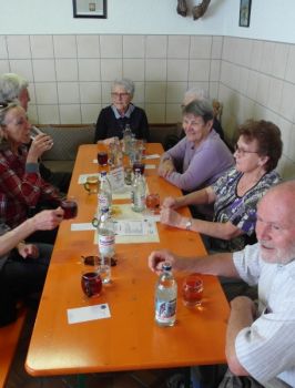 Nach ca. 1,5 Stunden erreichten die Wanderer den „Aubesen“ in Münster, wo sich noch 5 weitere Teilnehmer dazu gesellten, die direkt mit der Bahn gekommen waren. Schnell waren die durstigen Einkehrer mit Getränken versorgt und schon kurze Zeit später wurden die ersten Essensbestellungen getätigt. Nachdem sich alle reichhaltig gestärkt und die Besenwirtin sogar noch „Gsälzbrot“ zum Nachtisch spendiert hatte, ging es zum gemütlichen Teil über und es wurde fröhlich gesungen und geschunkelt. Dank an die Vorstandschaft für die Organisation dieses Besenausflugs.