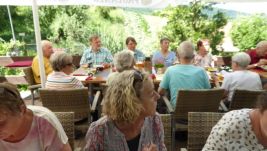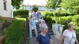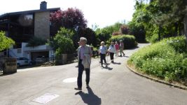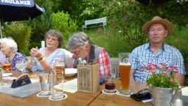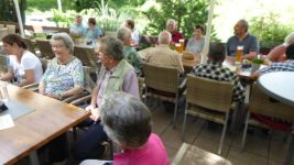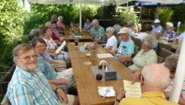 Nach einer kurzen Fahrt im Bus ging es ab der Haltestelle Nussweg in Nellingen zu Fuß weiter durch das Wohngebiet am Zollberg und entlang der Hohenheimer Straße talwärts in Richtung der Kleingartenanlage in der Weilstraße. Der Ausblick hinunter in die Stadt und auf die Esslinger Weinberge war herrlich, so dass immer wieder kurz angehalten wurde, um einen Blick in die Umgebung zu werfen. Nach knapp einer Stunde erreichte die Wandergruppe das Vereinsheim der Kleintierzüchter, die idyllisch im Grünen gelegene Gaststätte „Hasengarten“. Dort gesellten sich wenig später 10 weitere Teilnehmer dazu, die mit öffentlichen Verkehrsmitteln oder Privatfahrzeugen in die Pliensauvorstadt gekommen waren. Schnell hatte jeder auf der Terrasse ein schattiges Plätzchen gefunden und bei leckerem Essen und kühlen Getränken ließ es sich in der gemütlichen Gartenwirtschaft gut aushalten. Natürlich wurde zwischendurch auch das eine oder andere Liedchen angestimmt. Am frühen Nachmittag traten alle zusammen den Heimweg an. Nach einem kurzen Fußmarsch zur Haltestelle in der Weilstraße ging es mit dem Linienbus wieder zurück nach Denkendorf. Herzlichen Dank an unseren Vorstand Dieter Waller, der dieses Jahr federführend diesen Spaziergang organisiert und für einen reibungslosen Ablauf gesorgt hat.