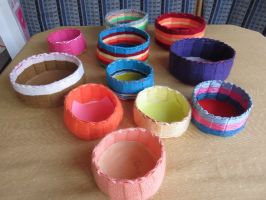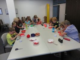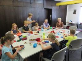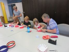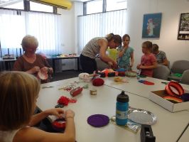 Diese wurde in Form geknickt, die Wolle für die ersten Flechtrunden ausgesucht und auf der Schablone festgeklebt. Anfangs noch etwas zaghaft machten sich die Kinder ans Werk. Nach kurzer Zeit hatten sie jedoch den Dreh raus. Eifrige Hände flochten Runde um Runde, wechselten die Wolle und es entstanden farbenfrohe, sehr individuelle Körbchen. Als kleine Stärkung für zwischendurch ließen sich die „Korbflechter“ Kekse und Getränke schmecken. Für die Innen- und Außenböden schnitten die Bastlerinnen und Bastler Filzscheiben zurecht und klebten sie auf. Mit Unterstützung des SoFePro-Teams, welches das Flechtwerk durch mehrmaliges Umnähen fixierte, wurden die Körbchen fertiggestellt. Stolz präsentierten die Kinder ihre selbstgebastelten Körbe für das Erinnerungsfoto.