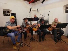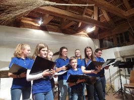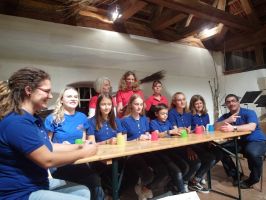 In einem weiteren Programmblock präsentierte der Jugendchor „Fermate“ unter der Leitung von Marion Weiß sehr überzeugend Titel wie „Der Teufel und der junge Mann“ oder „Five Hundred Miles“. Ein tolles Highlight landete „Fermate“ zum Schluss mit dem „Cup-Song“. Neben dem Singen muss hier nämlich auch noch rhythmisch mit Bechern auf einen Tisch geklopft werden – gar nicht so einfach! Begleitet wurden die Ensembles von Elena Rasschiwina am E-Piano. Überraschung beim zweiten Auftritt der „Stimmgabel“. Die Sängerinnen und Sänger waren alle im Western-Outfit auf die Bühne getreten und unterhielten schwungvoll mit „Der wilde, wilde Westen“ oder „Take me home, country roads“. Diese Titel wurden von Nicole Ringwald, Johannes und Hansjörg Henzler sowie Gerhard Thumser auf der Gitarre begleitet, was natürlich richtige Country-Stimmung vermittelte. Ein weiterer Höhepunkt war zweifelsohne der Auftritt der Stimmgabel-Männer, die parodistisch das tragische Lied vom „Hahn von Onkel Giacometo“ präsentierten.