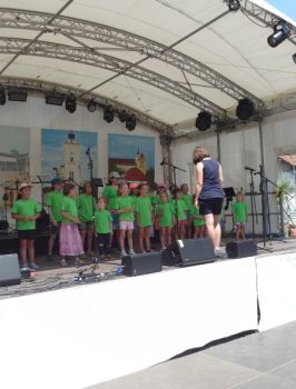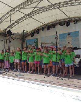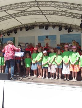 Die wenigen Schattenplätze waren schnell belegt. Eine knappe Stunde lang unterhielten die Ensembles des Liederkranzes die Gäste mit schwungvollen Melodien. Den Anfang machten die Jüngsten des Vereins – die „Klangsternchen“. Unter der Leitung von Jana Holzäpfel und Lena Mezger präsentierten sie fröhlich und unbeschwert vier Lieder aus ihrem Repertoire. Nach ihrem Schlusslied „Ich kenn nen Bär“, durften die Chorkinder – passend zum Liedtitel - kleine Tütchen mit Gummibärchen in die Zuschauermenge werfen.