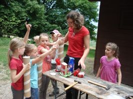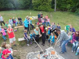 Bereits am frühen Vormittag starteten die „Großen“ zu einer Radtour von Denkendorf nach Bissingen/Teck. Dieter Waller und Raimund Bauer begleiteten die Gruppe auf der landschaftlich reizvollen dreistündigen Tour zum Otto-Mörike-Haus. Die Chorkinder der „Klangsternchen“ wurden erst kurz vor Mittag von den Betreuern in Privatautos auf die Alb gebracht. Gleich nach der Ankunft gab es Mittagessen, so dass sich alle ausreichend stärken konnten. Nach einer kleinen Bastelaufgabe starteten die Chorkinder gruppenweise zu einem kurzweiligen Geländespiel. Der Parcours mit Wissens-, Schätz- und Geschicklichkeitsaufgaben führte durch den Wald und über die Wiesen rund um das Otto-Mörike-Haus.